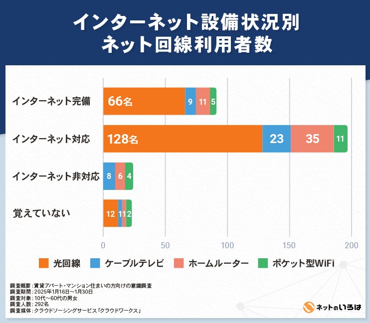 一番少なかったのは「インターネット非対応」で、17名/292名(全体の6%)でした。インターネット非対応とは、光回線やケーブルテレビなどの固定回線が利用できない物件のことです。このような非対応物件ではホームルーターやポケット型Wi-Fiなど、工事不要のモバイル回線を利用する方が大半でした。