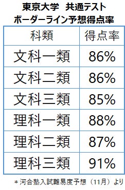 東大入試の第一関門となる大学入学共通テストでは、最低でも85%、科類によっては90%を超える得点率が要求されます(右表参照)。このひときわ高い得点率をつかみ取るには、各科目の入念な対策に加え、本番と同様の時間・形式で演習を重ねておくことが効果的です。