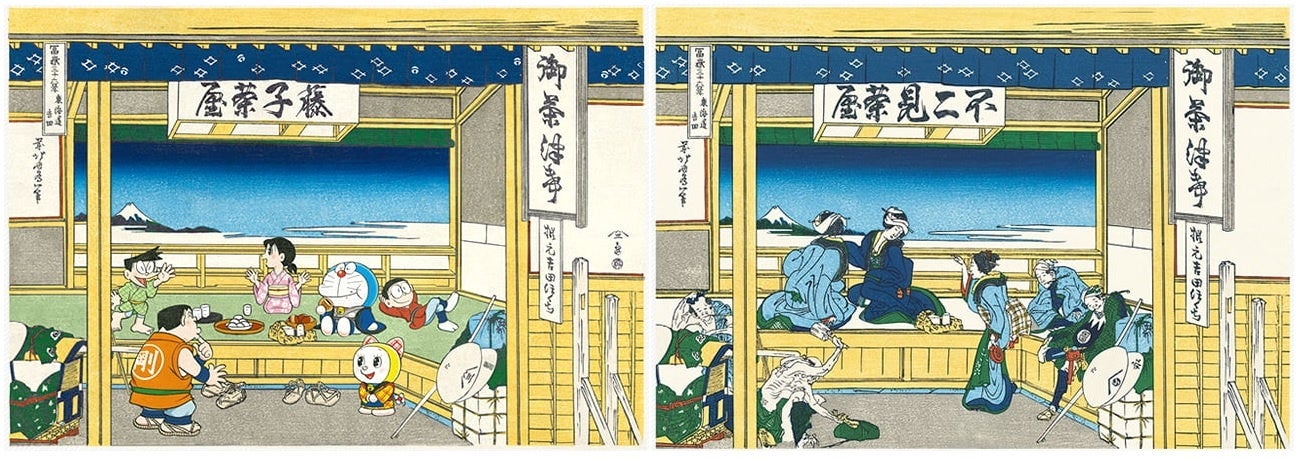 ドラえもん 浮世絵木版画シリーズ新作が12月26日より予約開始!!北斎の名作、茶屋の座敷から富士を望む粋な構図に登場するドラえもんたちの姿に癒される一枚
