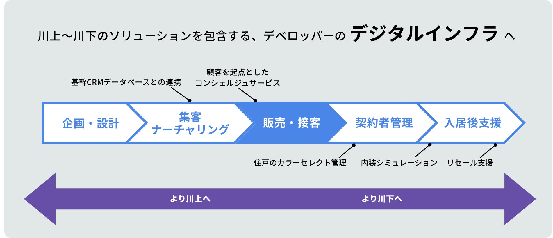 ROOVはこれまで、新築マンションの「販売・接客」フェーズにおける顧客体験を変革してまいりました。 今後は、ROOV上に顧客体験をさらに集約し、基幹CRMや公式サイトとのデータ連携を通じて、集客・ナーチャリング支援(川上)から契約者管理・入居後支援(川下)までを一気通貫でサポートしていきます。 この取り組みにより、ROOVは「不動産デベロッパーのデジタルインフラ」として、業界全体のDXを支える存在へと進化してまいります。