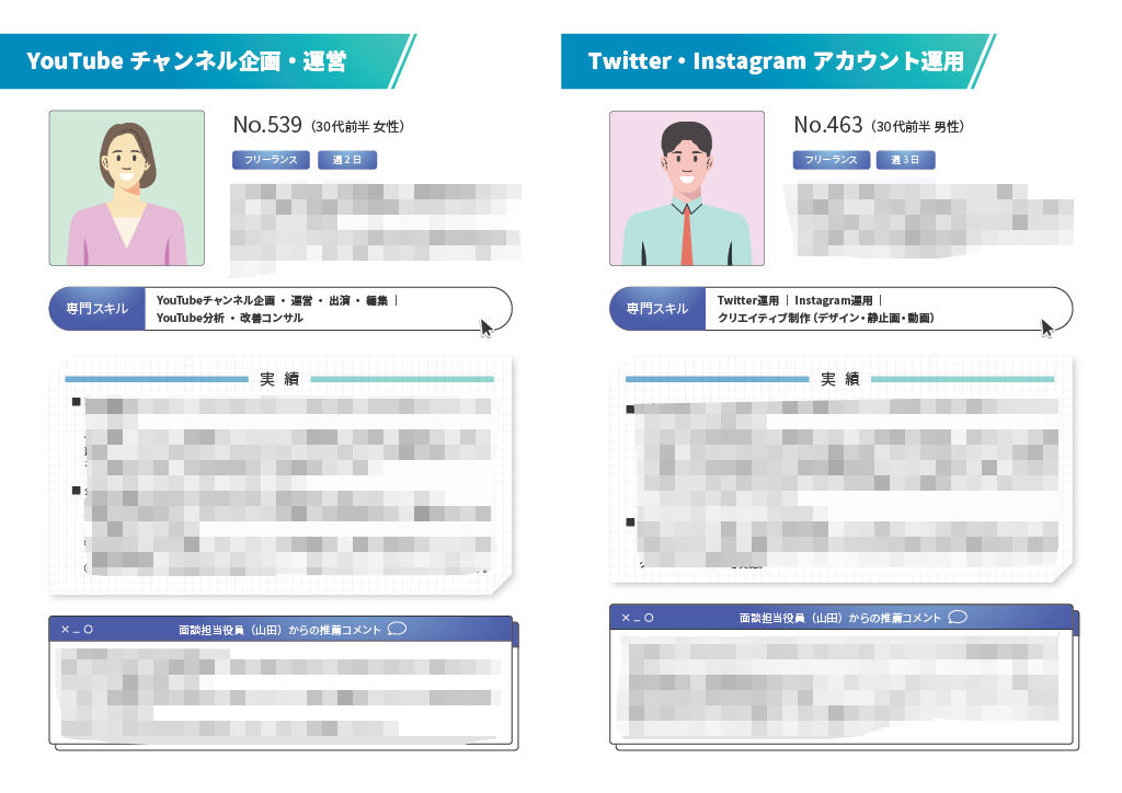 (推薦コメント例:「過去当社からスポットでコンテンツ制作の依頼をいたしました。早い・高品質・コミュニケーションがスムーズと三拍子揃っている方です。当社専属になっていただきたいですが、この気持ちをグッと抑えてお客様にご紹介します。」)