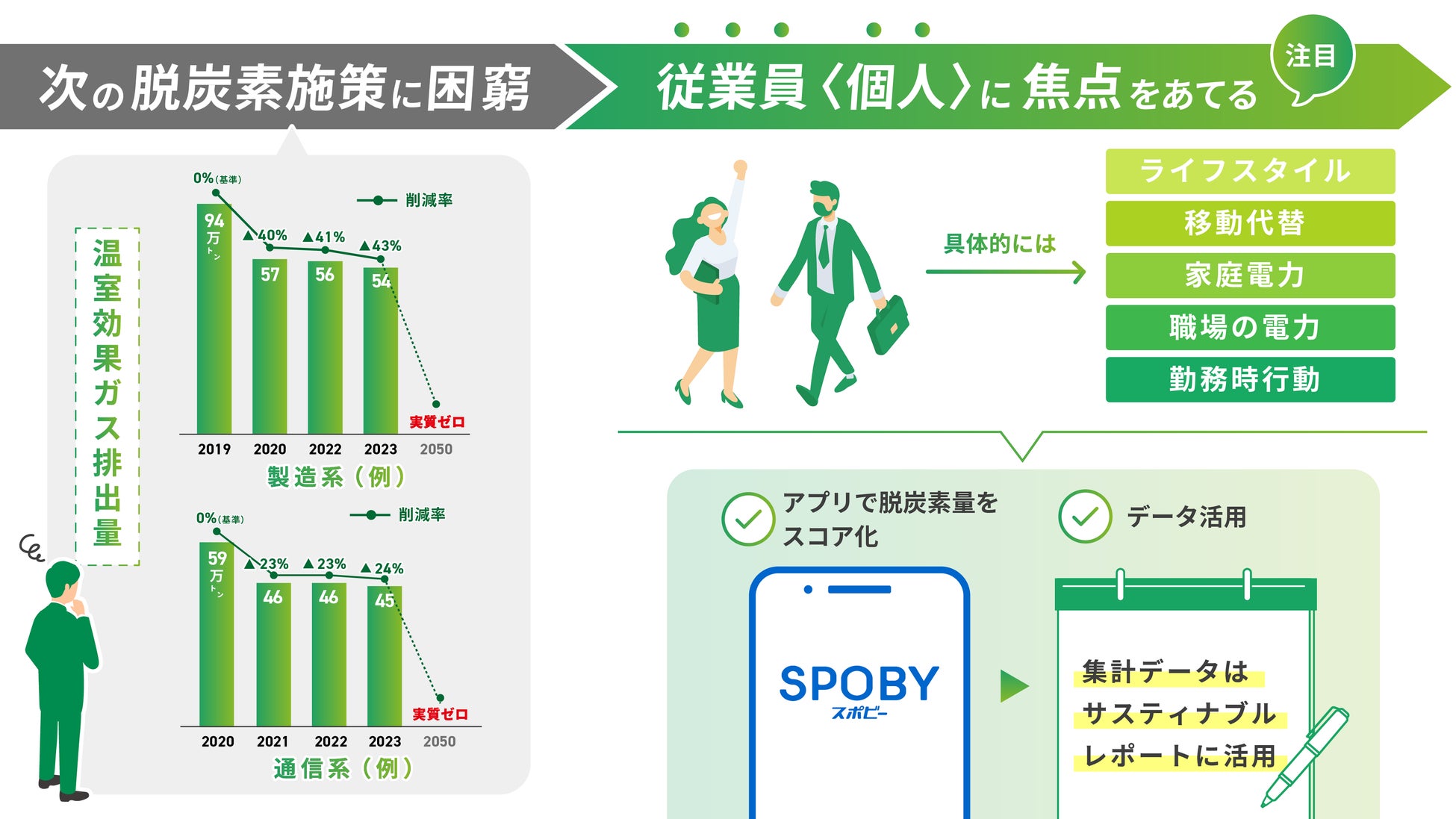 実施概要 :参加する民間企業の総勢10万人強の従業員の皆様および地域市民の皆様が、エコライフアプリ「SPOBY(スポビー)」を使い、CO2排出抑制を目指します。