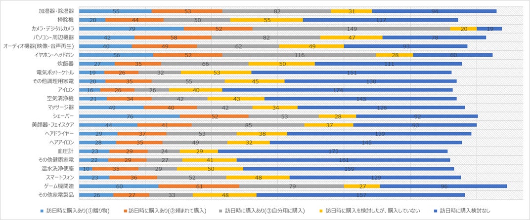 一方で訪日時に「購入検討なし」で回答が多かった家電製品は「アイロン」(174)、「血圧計」(173)、「その他健康家電」(161)などでした。