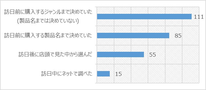 「訪日前に前に購入を決めていた」と回答した人が73.7%:196人で、7割を超える人が訪日以前から家電製品の購入を決めていました。そのうち、全体の41.7%(111人)は「購入するジャンル(製品名は決めていない)を決めていた」、32%(85人)は「製品名まで決めていた」と具体的な製品の購入を決めてから、訪日していました。「訪日後に店頭で見た中から選んだ」人は20.7%(55人)。「訪日中にネットで調べた」人は5.6%(15人)と少数でした。
