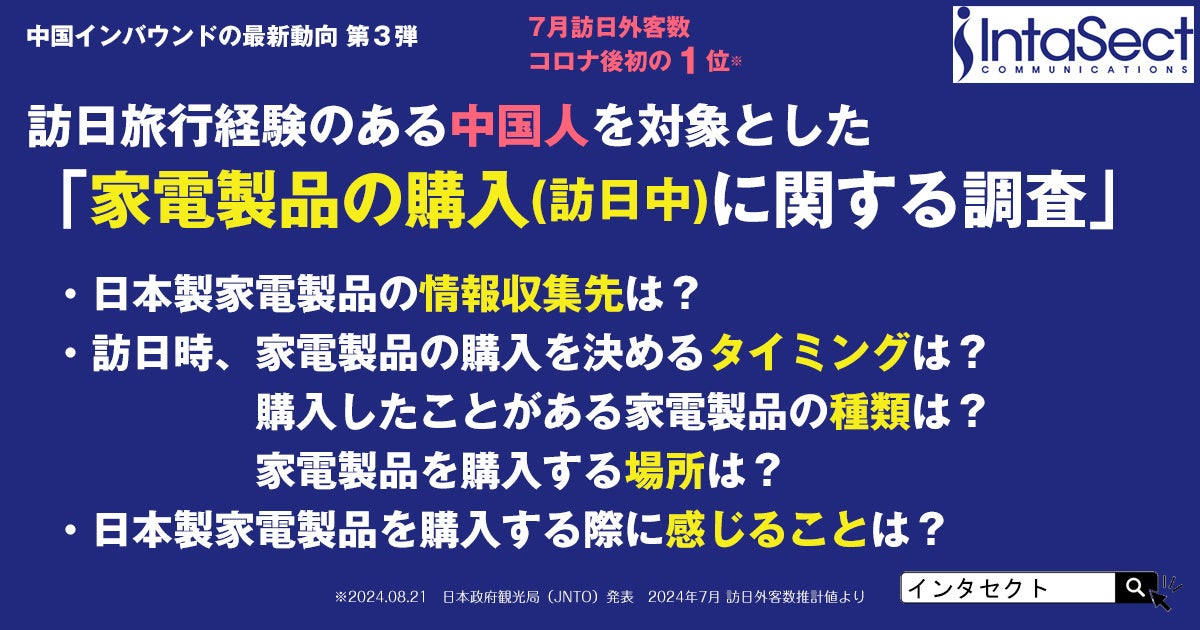 中国・台湾などの海外プロモーション・インバウンド支援を行うインタセクト・コミュニケーションズ株式会社(本社:東京都千代田区、代表取締役社長:譚 玉峰、以下 インタセクト)は、中国からのインバウンド観光が回復基調にある中、その最新動向を探るべく、訪日旅行経験のある中国人を対象に「訪日時の家電製品の購入に関する調査」を実施しました。本ニュースリリースでは、その調査結果を発表いたします。