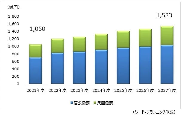国内防災関連市場は成長の一途をたどっており、防災に関連する情報システム・サービス市場は調査会社のシードプランニングによると、2021年は1050億円となっています。以降は増加トレンドとなっており、2027年には1533億円となることが予想されています。年平均で6.5%の伸び率となっています。