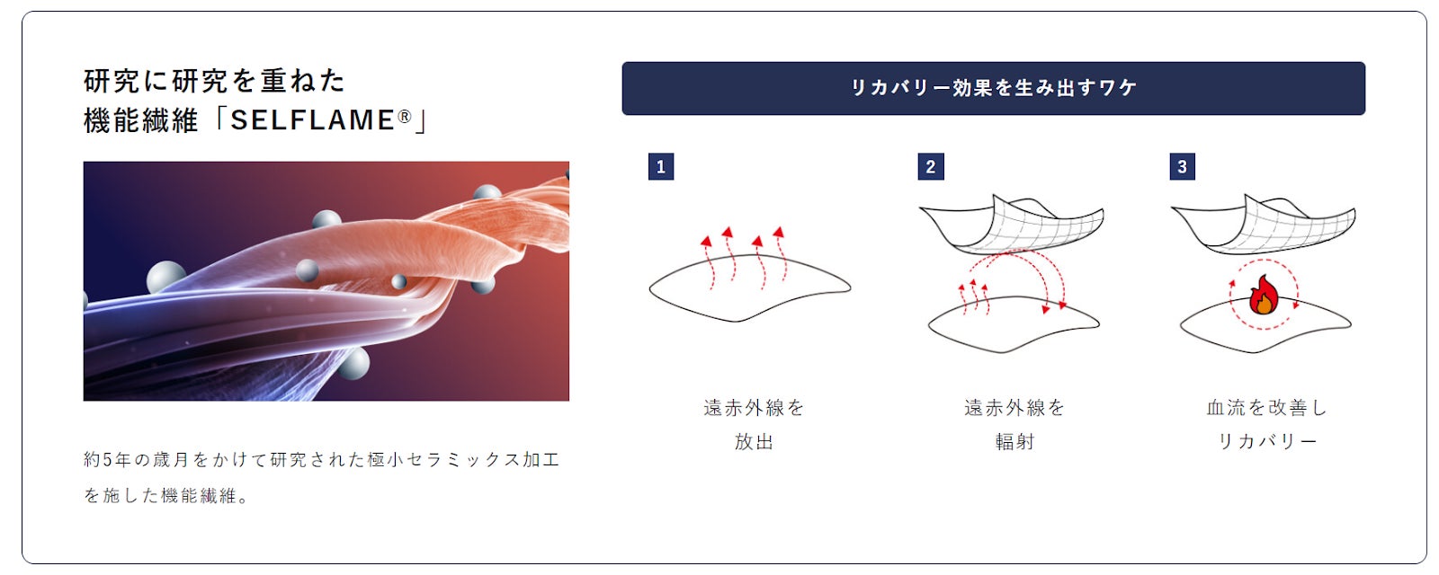 機能繊維「SELFLAME®︎」が衣類と肌の間で体温を輻射することにより、血行促進による疲労軽減や筋肉のコリ・ハリの軽減に繋がります。繊維自体は発熱せず、どんな季節でも快適な睡眠へ誘います。
