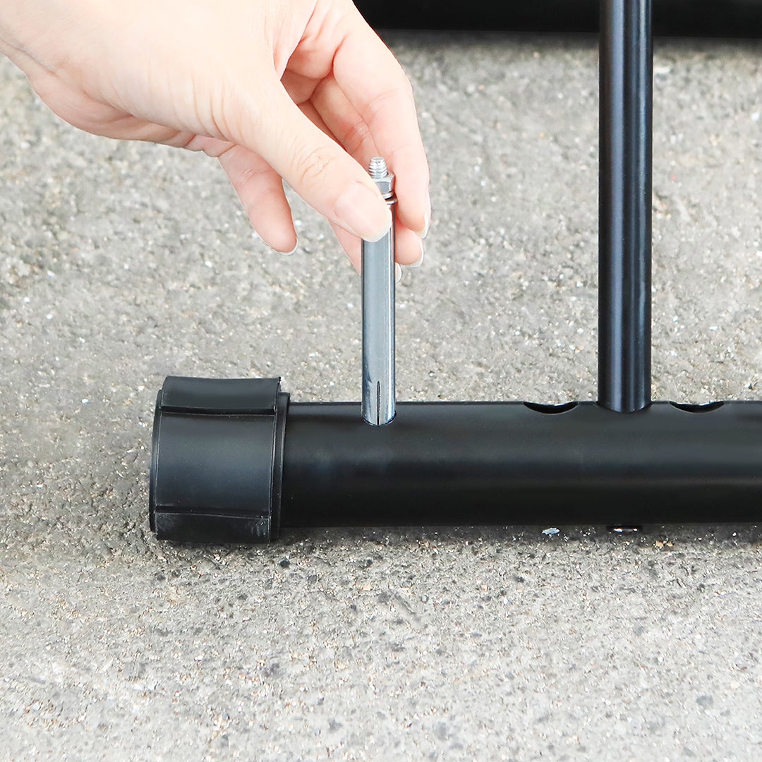 スタンドのベースキャップ部分を回して高さを5段階調整できるため、凸凹のある地面でもガタツキを押さえ、安定した設置が可能です。付属のアンカーボルトを使用し、スタンドを地面に固定すれば、耐風性が強化され、盗難防止対策にもなります。
