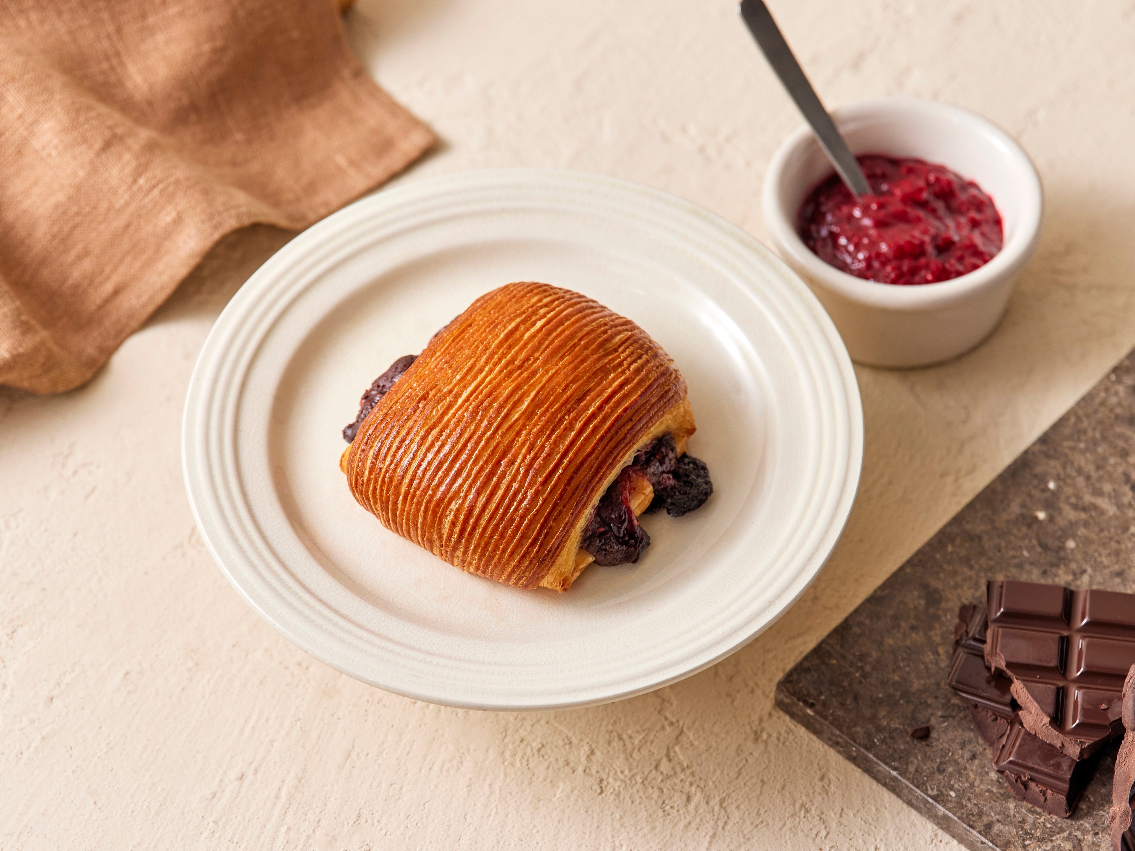 プリンチ®独自の「コルネッティ」生地はそのままに、生地の折り込み方を変えることで、より“バリバリ”感をお楽しみいただけるパンスイススタイルのコルネッティです。通常の「コルネッティ」では内側に折りたたまれる生地を外側にすることで、バリっとした食感が楽しめる焼き上がりにこだわりました。中のフィリングは、程よい甘さのチョコレートと、このために作ったプリンチ®オリジナルのラズベリージャム。甘さと酸味のバランスが、“進化系クロワッサン”のバリっとした食感と独特のハーモニーを生み出します。