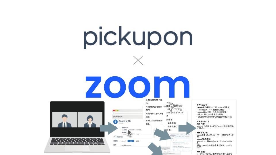 pickupon株式会社(千葉県市川市、代表:小幡洋一、以下pickupon)は、SFAへの入力に特化した電話&MTG 議事録AI 「pickupon」(ピクポン)とZoom連携βをリリースいたしました。これにより、電話だけでなくZoomによるオンライン商談・ミーティングの内容も、自動的に記録されるようになり、より一層の営業DX化をサポートいたします。