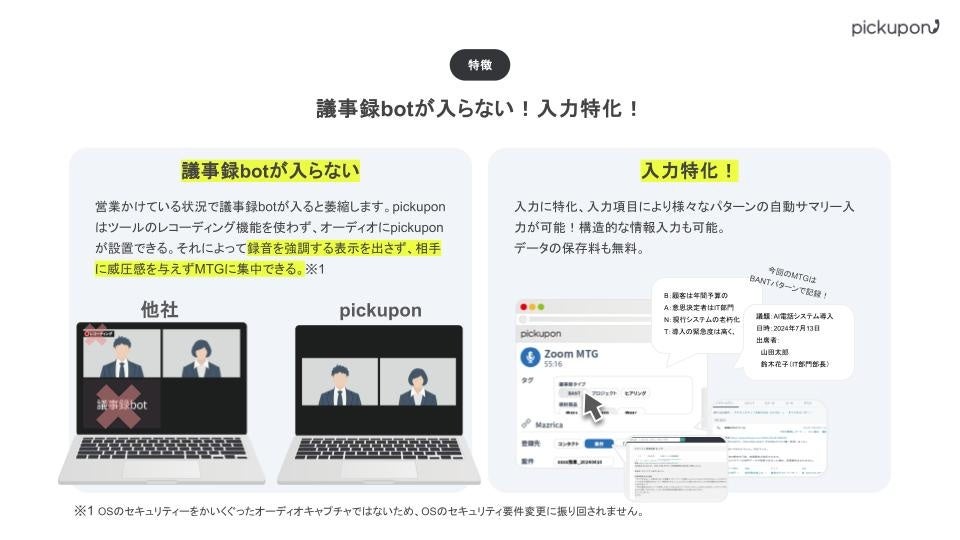 営業をかけている最中に議事録botが入ると萎縮してしまいます。pickuponはツールのレコーディング機能を使わず、オーディオにpickuponが設置できる。それによって録音を強調する表示を出さず、相手に威圧感を与えずMTGに集中できる。※1