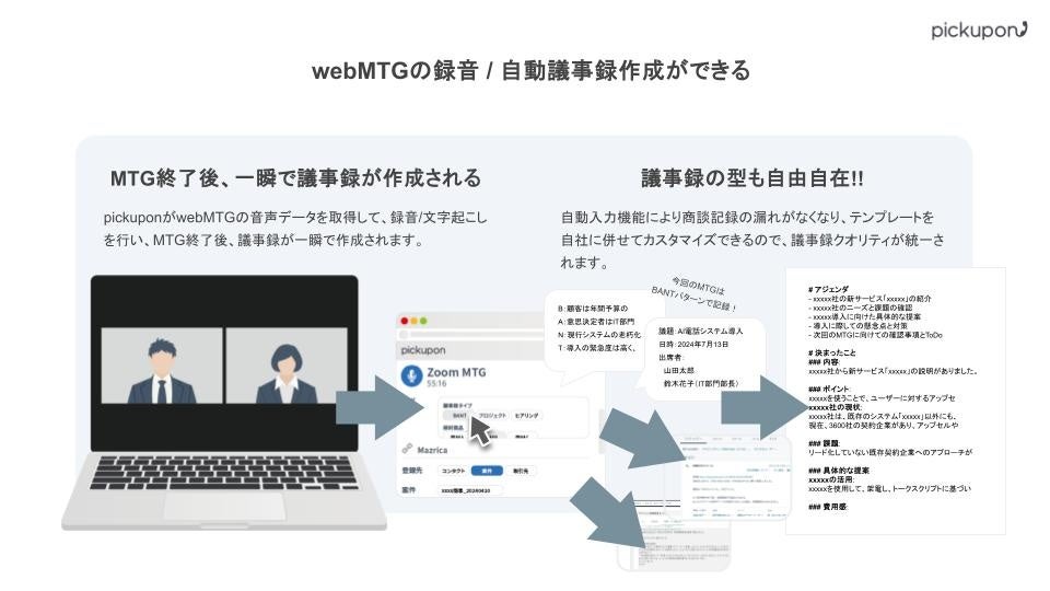 pickuponがwebMTGの音声データを取得して、録音/文字起こしを行い、MTG終了後、議事録が一瞬で作成されます。