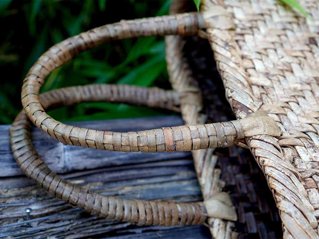 自然素材のバッグは、使えば使うほどにその風合いが増し、愛着が深まるものです。しかし、日々の使用によって傷んでしまうことも避けられません。そこで竹虎では、素材の特性を活かした修理を通じて、お客様の大切なアイテムを長くご愛用いただけるようサポートしています。今回修理したバッグには、それぞれの素材に合わせた修理方法を採用しています。表皮の有無に応じて修理用のヒゴを使い分け、自然素材の美しさを引き立てました。