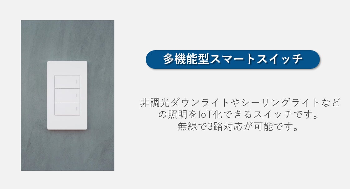 さらにホームコントロールに活用できる機器として、3路スイッチ対応が可能な「多機能型スマートスイッチ」も導入されています。本物件は2階建てロフト付きですが、「多機能スマートスイッチ」で照明を遠隔操作できるため、階段を使わずに家中の照明やスマートホーム機器を一括で操作できます。