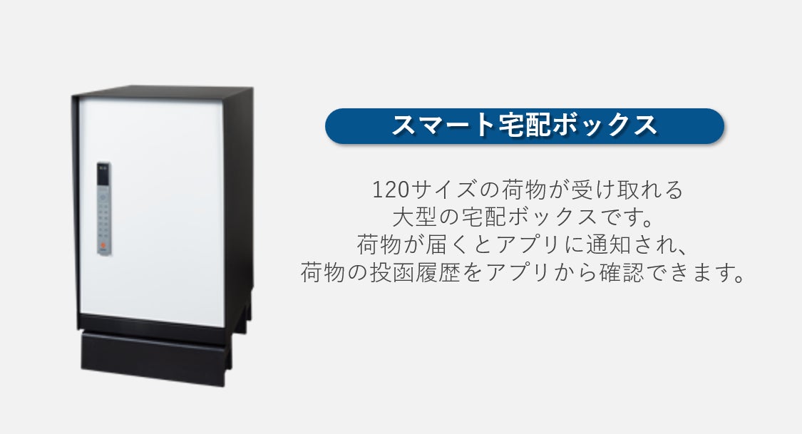 屋外には「スマート宅配ボックス」が設置されており、荷物の到着状況をスマホから確認し、QRコードを表示して解錠することができます。ボックス内にカメラが内蔵されているため、配達物を確認することができ、長期間不在にする場合やアウトドアに出かける際の中継地点として製品を先に配送した場合も、安心して荷物を受け取ることが可能です。