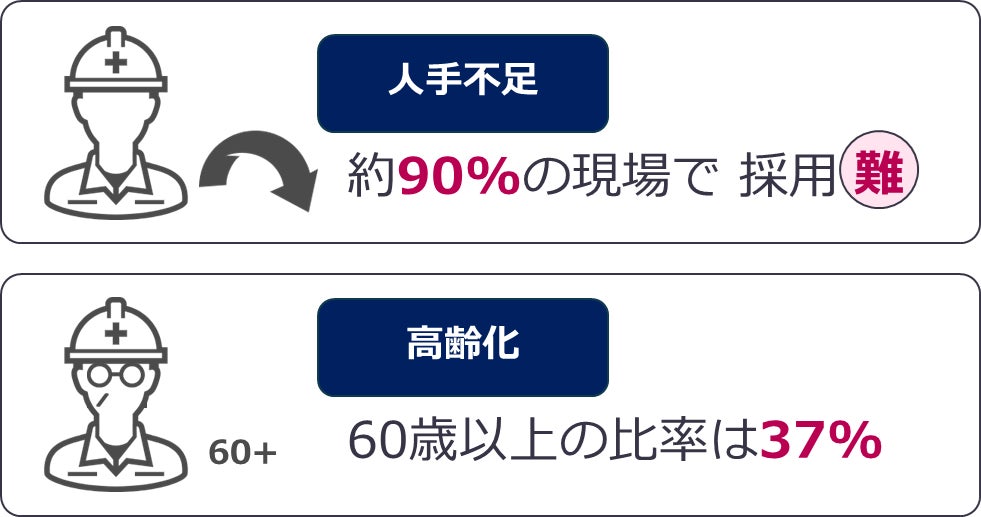 現場担当者の悩みごとのトップとして現場作業員の不足がありますが、現場作業員の採用に対しては89.7%の担当者が「集まりにくい」と回答していることから、慢性的な人手不足を解消することが非常に難しいことが分かります。ほかにも、60歳以上の作業員比率は約37.2%以上となっており定年退職の対応が必要となりますが、約77.2%の担当者からは「現場従業員の若返りが図りにくい」という悲観的な回答が出ており、抜本的な改善までは時間を要することがうかがえます。(※1)