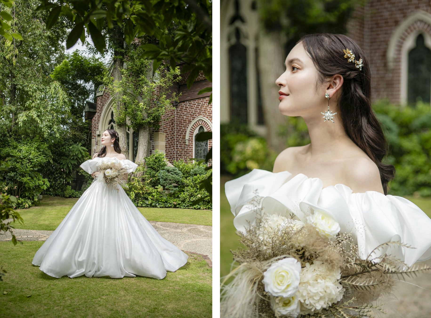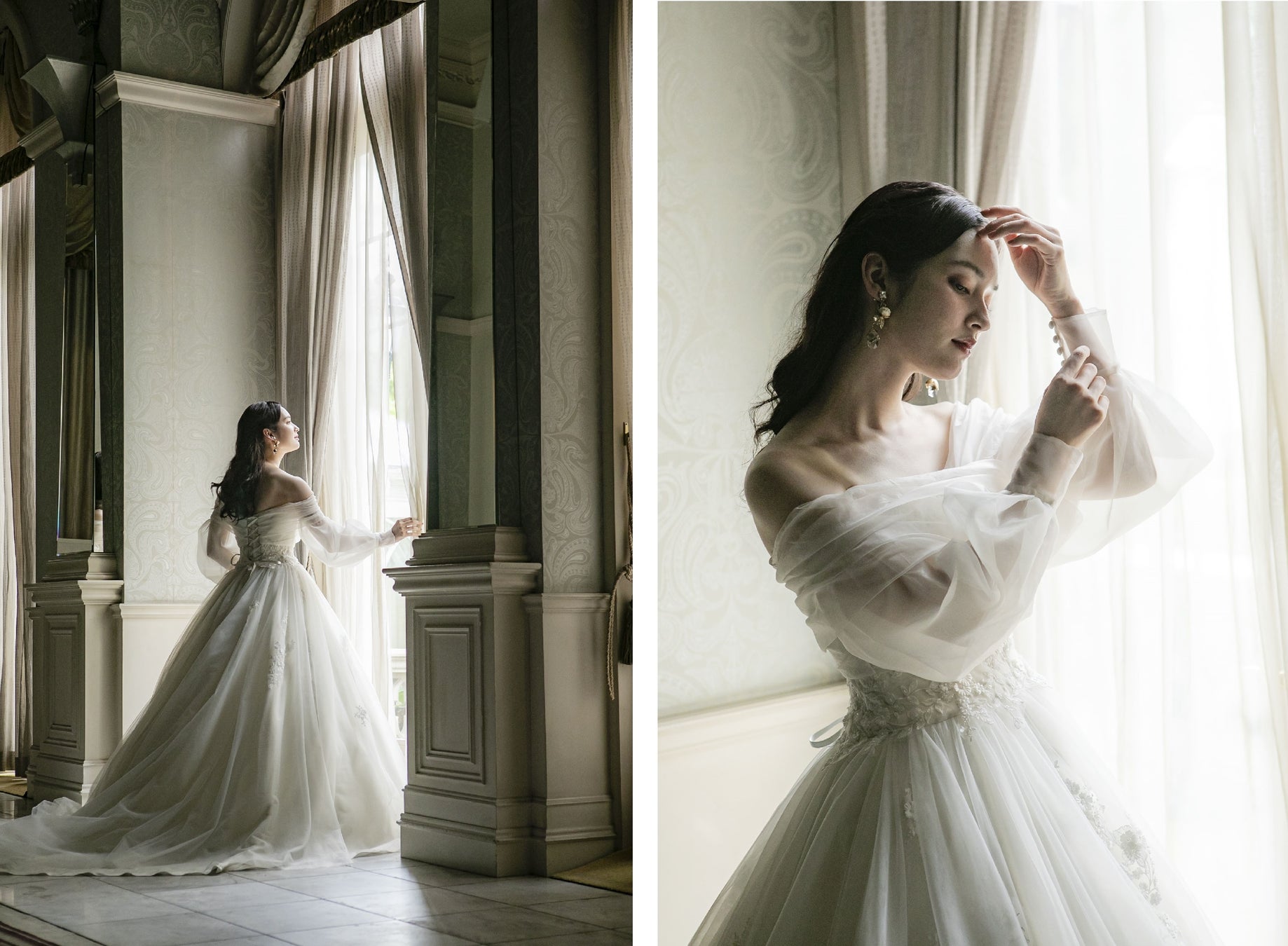 柔らかなオーガンジーを使用し、立体感があるパフ袖と袖口のくるみボタンが上品で、ふんわりとしたシルエットが印象的なドレスです。袖を外したオフショルダーのみのスタイルも、エレガントな雰囲気が際立つデザインとなっております。