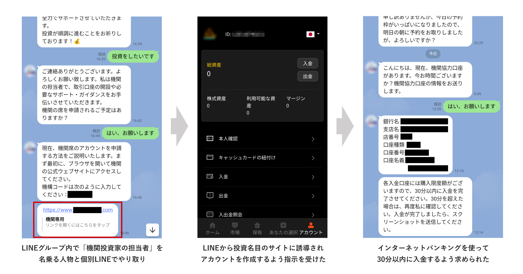 メッセージのやり取りを重ねて参加者を信じ込ませたのち、架空の投資話を持ちかけ、指定の口座に振り込ませるなどして金銭をだまし取ります。投資名目の架空のサイトやアプリに登録するよう指示し、画面上では利益が出ているように表示して信じ込ませたり、出金したいと伝えると事前に説明のなかった手数料を求めたりして、繰り返し振り込ませる手口も見られています。