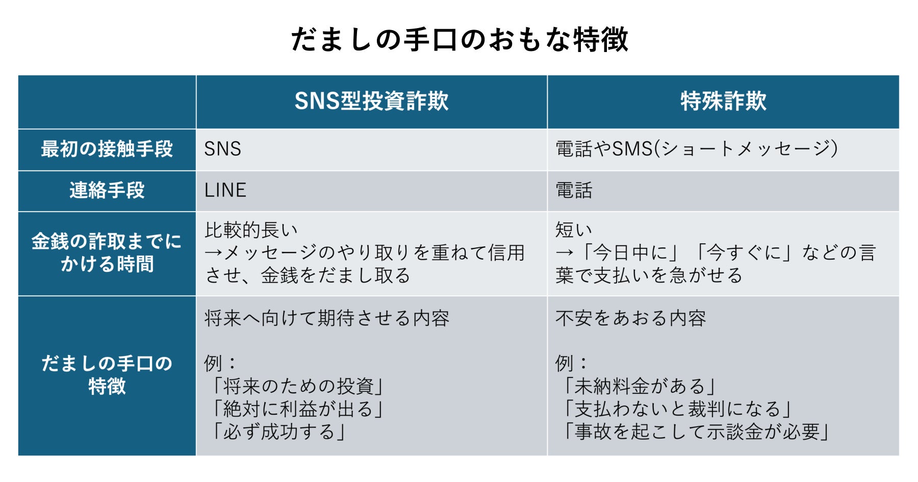 SNS型投資詐欺は、特殊詐欺のように電話や訪問で接触し金銭を詐取する手法とは異なり、非対面でのメッセージのやり取りを経て金銭を詐取する手法が特徴です。