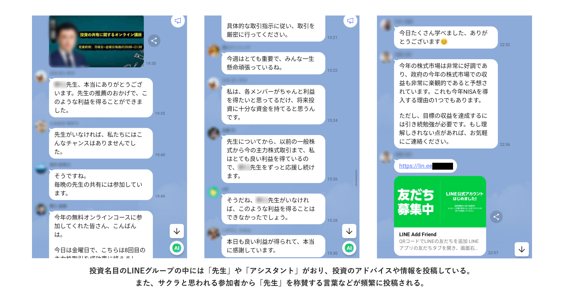 さらにLINEグループの中には、参加者を信じ込ませるための人物(サクラ)が存在している場合があり、「先生のおかげで利益が出た」「先生の指示どおりにやって成功した」などのメッセージが頻繁に投稿されます。