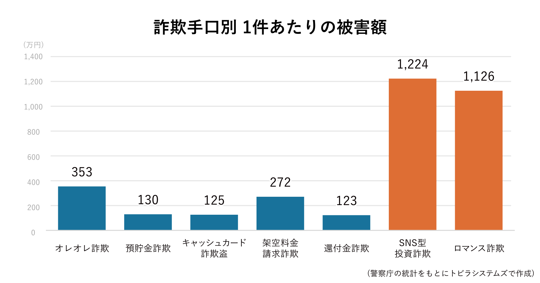 さらに、SNS型投資詐欺は特殊詐欺に比べて1件あたりの平均被害額が大きく、被害が深刻化しています。