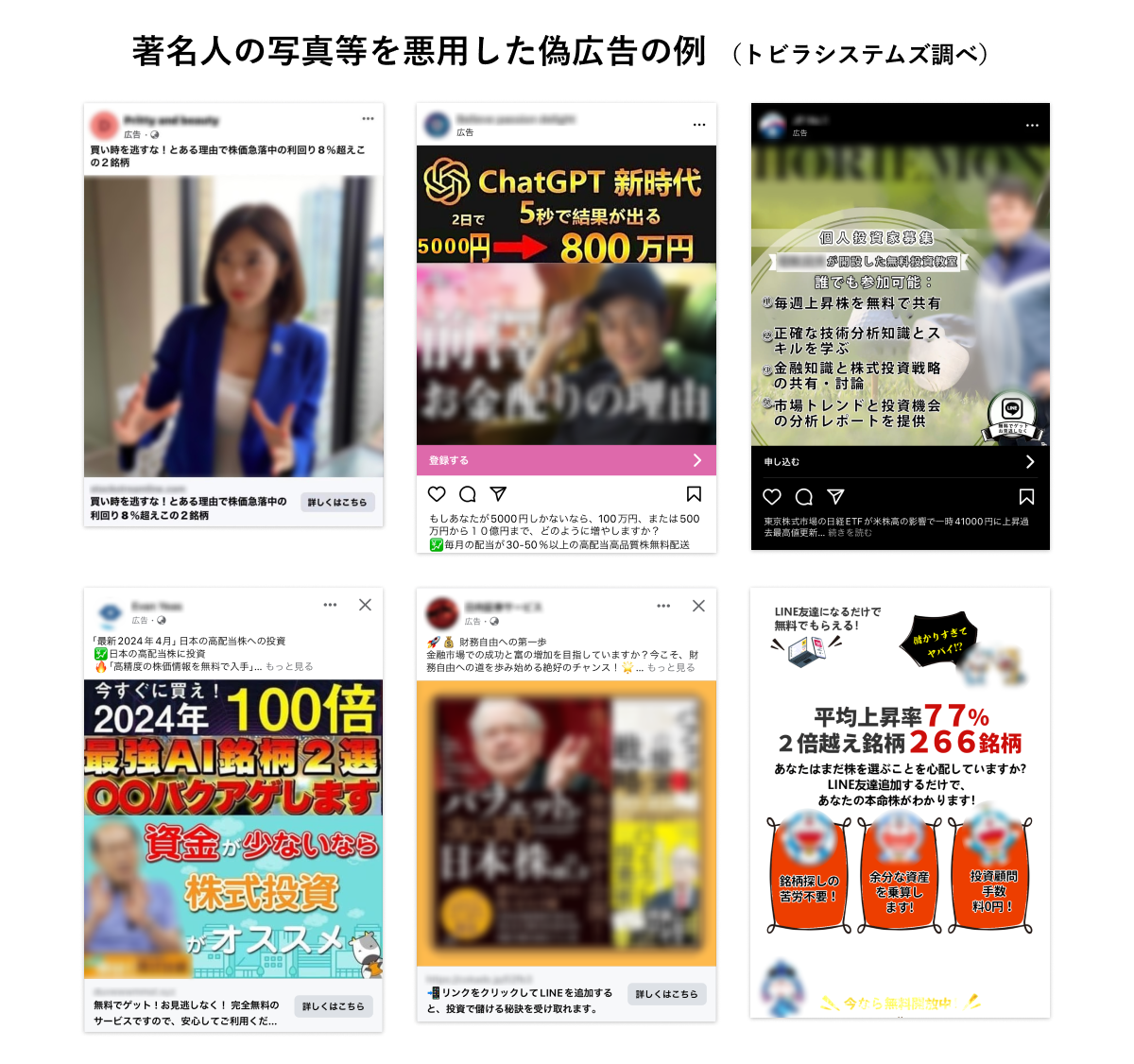 昨今は、SNS上に表示された偽広告からLINEグループに誘導し、メッセージをやり取りする中で、投資名目で金銭をだまし取る手法が多発しています。偽広告に著名人の写真が無断で使用される事案が多発しており、被害にあった著名人が政府に対して提言するなど、大きな社会問題となっています。