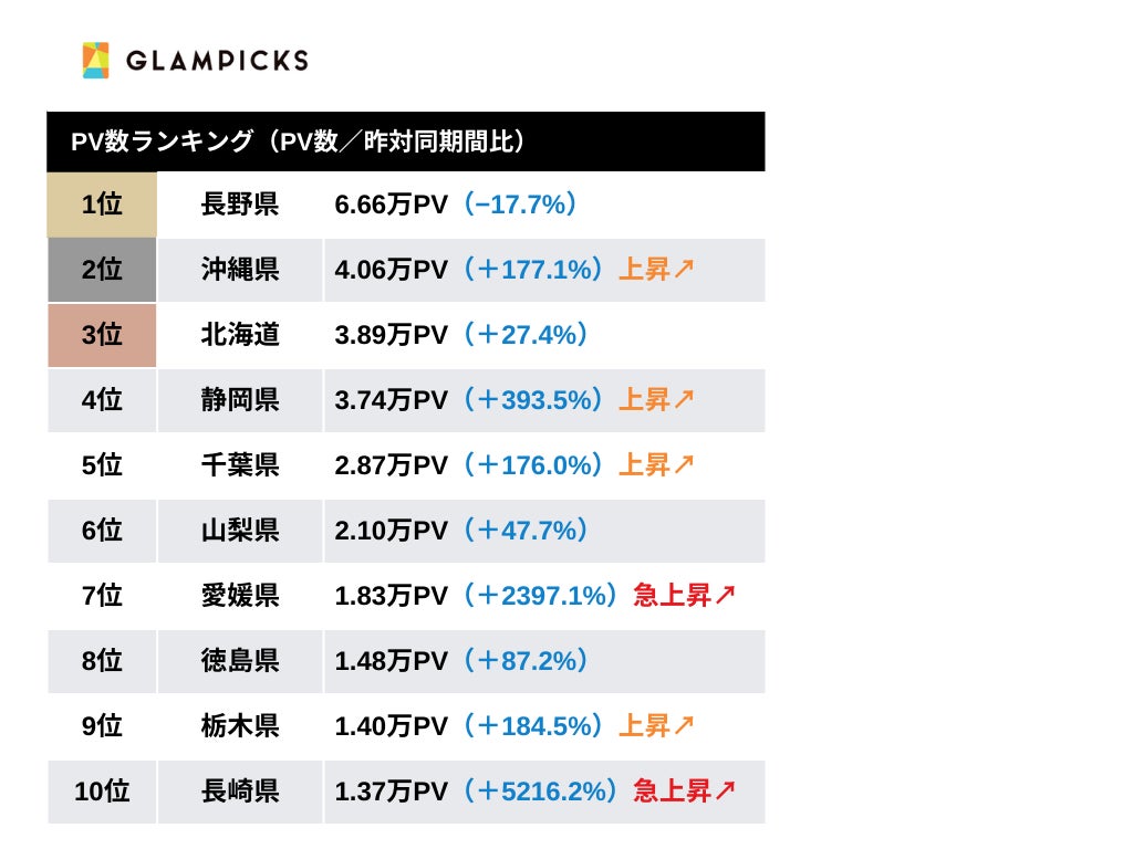 2023年上半期人気エリアランキング1位は「長野県」、次いで「沖縄県」、「北海道」と続きました。緊急事態宣言の解除ともあいまって、沖縄県や北海道などの遠方観光地への旅行も可能に。全国的な地域へのグランピング需要の広がりが読み取れます。