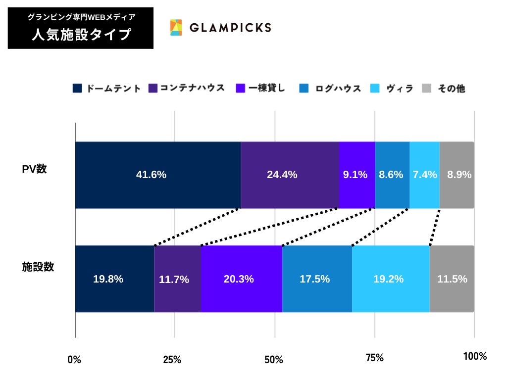 GLAMPICKSに掲載されている「ベルテント」「ヴィラ・貸別荘」「一棟貸し」「ドームテント」「コンテナハウス」「古民家」などの17施設タイプのページPV数と施設掲載数の割合を集計しました。