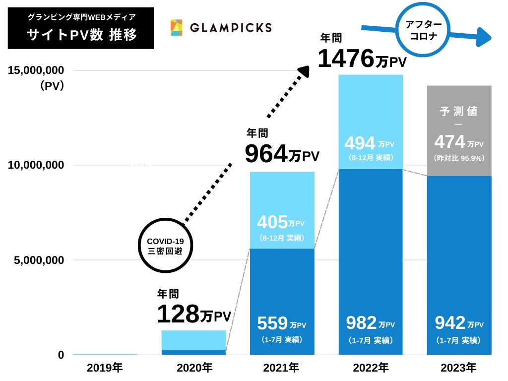 まず、2020年2月のコロナ蔓延により、旅行先の候補として「非接触」×「非日常」を体験できるグランピングが旅行先の候補として台頭。人気上昇にあいまって、グランピング施設専門のWEBメディアであるGLAMPICKSのサイトPV数も、2020年に128万PV、2021年に964万PV、2022年に1,476万PVで成長。2020年〜2022年のコロナ禍において、一気に成長していることが読み取れます。