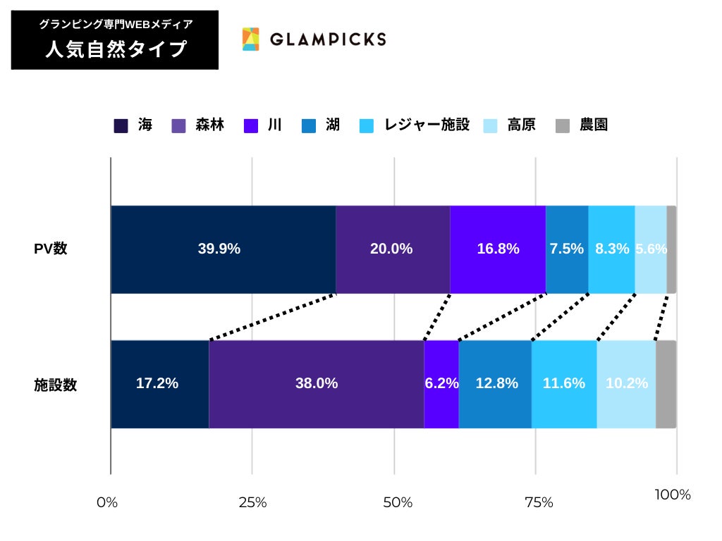 人気自然タイプのPV数は、「海タイプ(39.9%)」が施設掲載数の2倍以上と最も多く、次いで「森林タイプ(20.0%)」が続きました。また、「川タイプ(16.8%)」は施設掲載数に対して、PV数が比較的多い結果となりました。