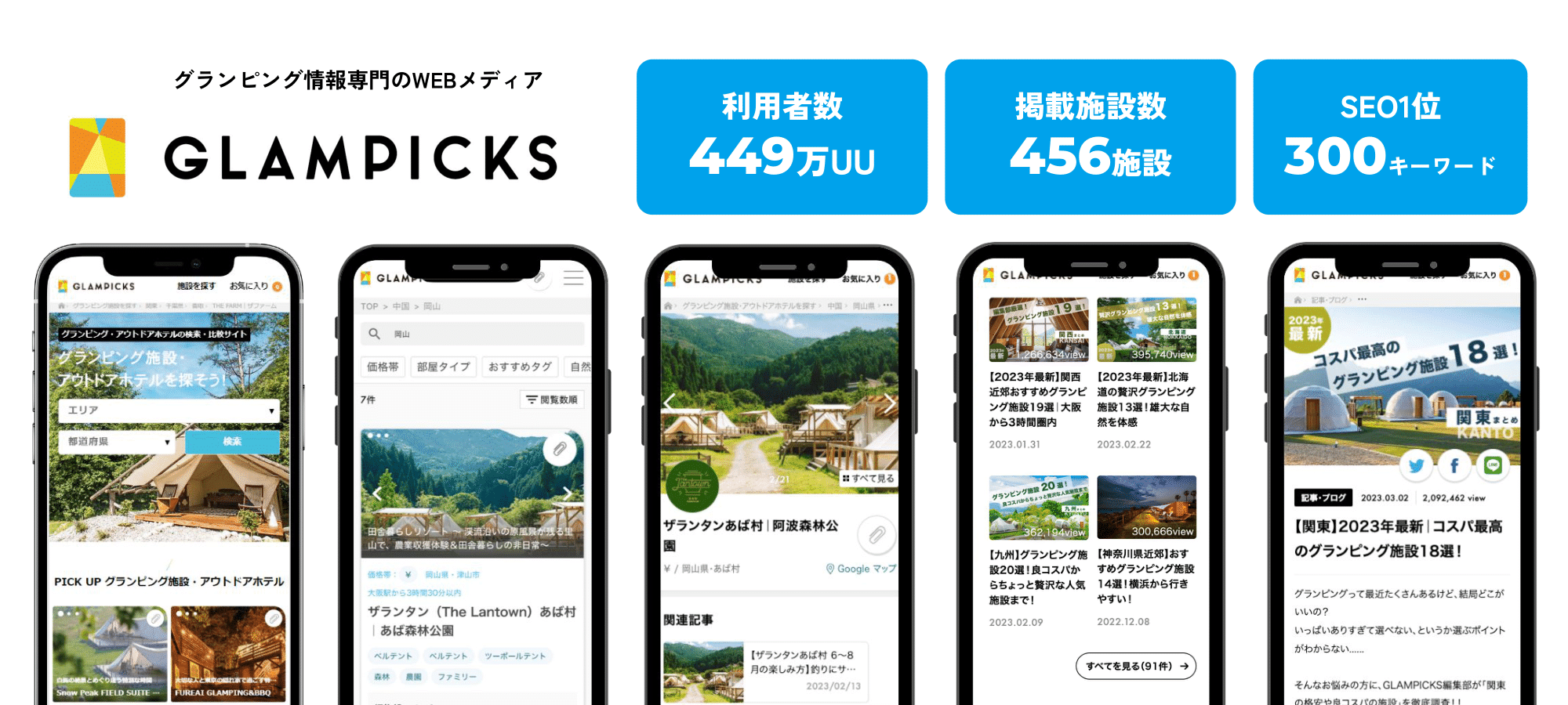 「GLAMPICKS」は、グランピング施設専門の情報サイトとして、2019年7月30日に運営開始いたしました。その後、新型コロナウイルス禍において三密回避の旅行先としてグランピングが人気急上昇したことに伴い、GLAMPICKSの利用UU数も増加。2020年には50万人、2021年には343万人と、順調に利用者を伸ばし、2022年には年間利用者数449万人、2023年8月1日現在は施設掲載数456施設と、グランピング情報が国内トップクラス(※)で充実しているWEBメディアへと成長しました。 (※2023年8月1日 自社調査)