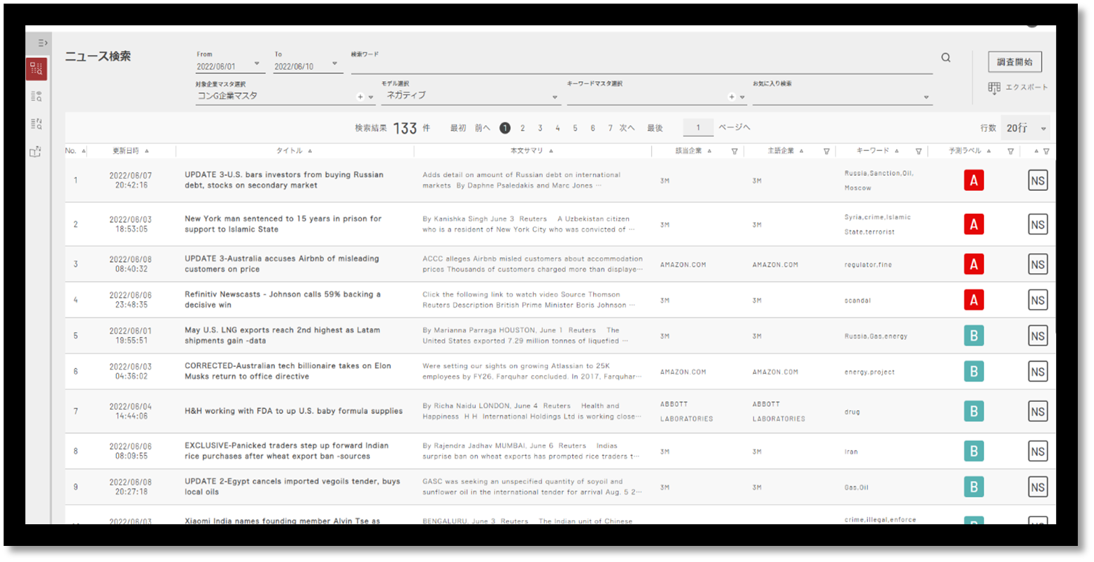 日々配信されるニュースに対して、同社のビジネス活動において重要度の高いネガティブニュースを分類し、スコアリング・優先順位付けを行います。