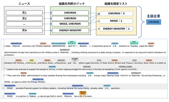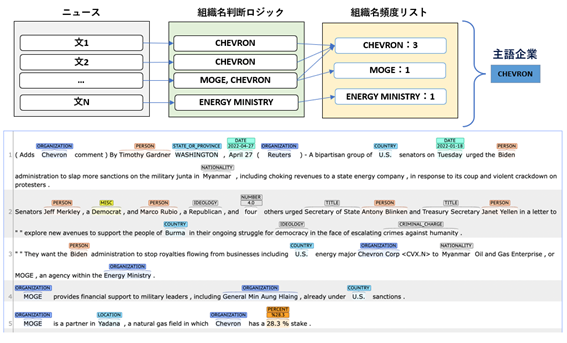 文脈でキーとなる会社名を識別することができます。例えば「Apple」という単語には会社名以外に、「りんご」の意味もあります。本システムは記事上に存在する固有の企業名を会社として認識し、各企業の文脈上の重要性を推測した上で、その中でも主体となっている企業名を抽出しています。