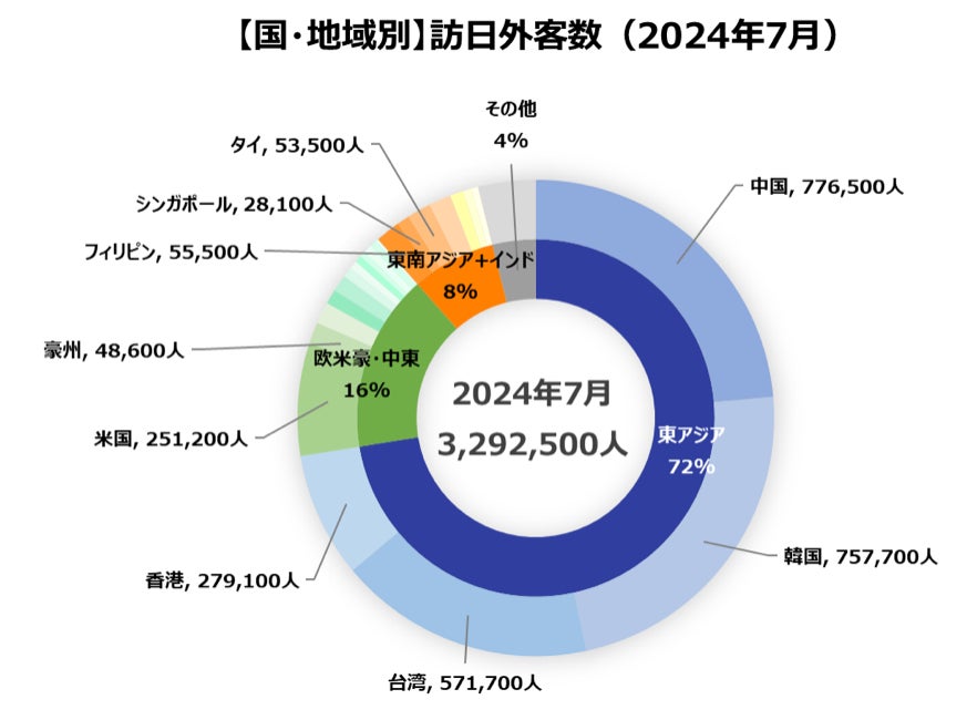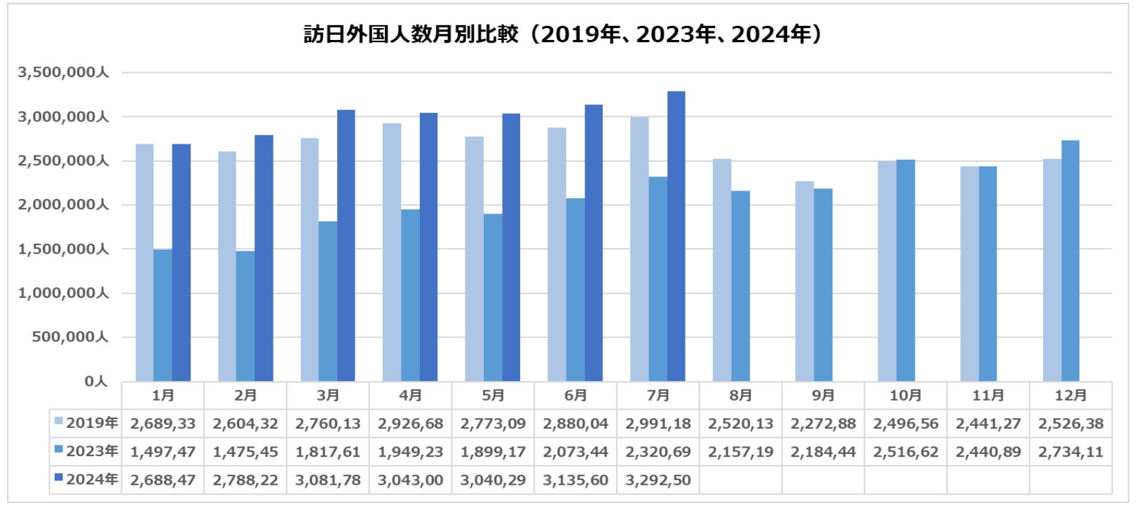 ・ 2024年7月の訪日外国人旅行者数は約329万人でコロナ禍前の2019年同月比10.1%増。