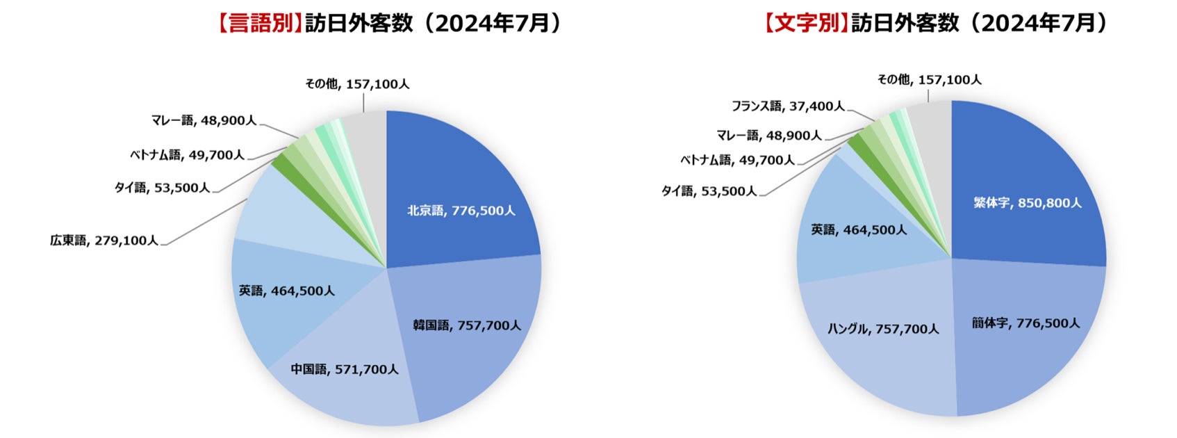 2024年7月に日本を訪れた訪日外客数を使用言語別にみると、北京語(中国)を使用する旅行者が最も多く、77万人が訪日しました。次いで、韓国語75万人、中国語(台湾)57万人、英語46万人となりました。また、使用文字別にみると、繁体字(台湾・香港)85万人が最も多く、次いで、簡体字(中国)77万人、ハングル(韓国)75万人、英語46万人となりました。