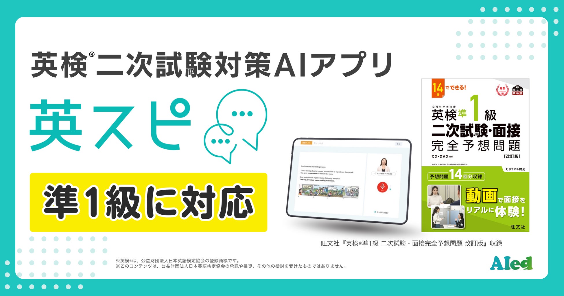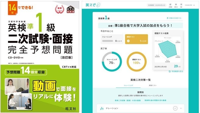 英スピ®では既存の3級・準2級・2級と同様に、株式会社旺文社の人気書籍『英検®二次試験・面接 完全予想問題 改訂版シリーズ』を収録いたします。このアップデートにより、英検®準1級のスピーキング対策がアプリ上で完結可能に。受験生にとっては実践的な練習環境を、学習塾にとっては省力化された効果的な指導手段を提供します。