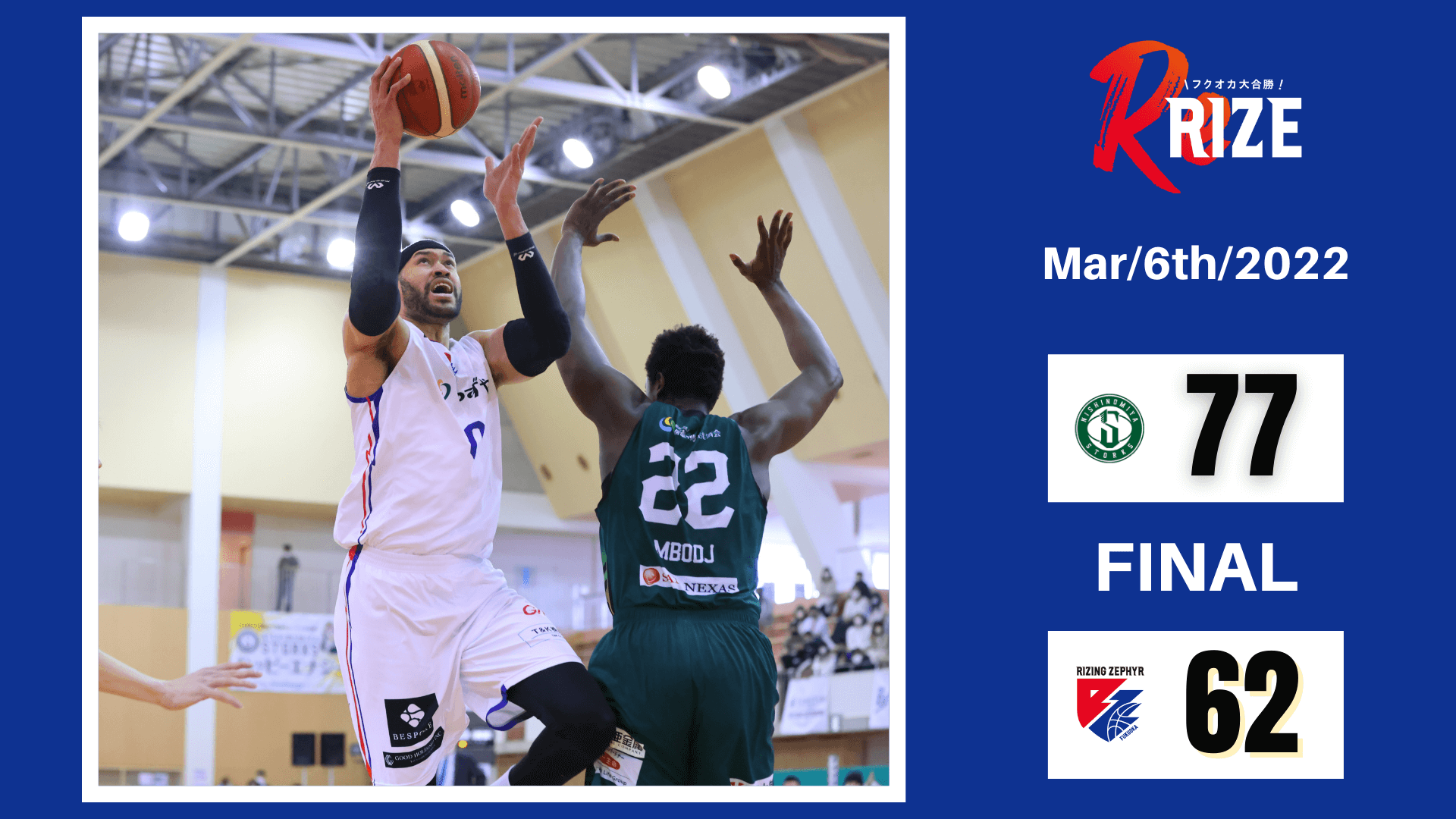 2022年3月6日(日)に開催されましたBリーグ第24節【西宮ストークスvs.ライジングゼファーフクオカ】において“西宮77-62福岡”の結果となりましたことお知らせいたします。