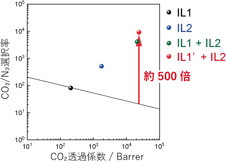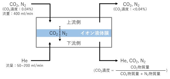 この混合イオン液体を多孔質材に含浸させることで、イオン液体膜を作製しました。作製したイオン液体膜の特性は図1に示すシステムで計測しました。膜の上流側にCO2とN2を混合したモデルガス(CO2濃度:0.04%)を、下流側にスイープガスとしてHeをそれぞれ供給しました。膜を透過したCO2とN2はHeと混合した状態で回収され、混合ガス中のCO2濃度は図1右下の式で表しました。イオン液体膜のCO2透過係数およびCO2/N2選択率を図2に示します。従来高分子膜の性能上限は、CO2透過係数が上がるとCO2/N2選択率が下がるトレードオフの関係を示し、CO2透過係数20,000 BarrerにおいてCO2/N2選択率は約20でした(図2中の実線)。図2に示すように、混合イオン液体膜の性能は、従来高分子膜の性能上限を大きく超えました。具体的には、大気中CO2と同程度の0.04%のCO2を用いた試験で、CO2/N2選択率は従来膜の約200倍に達しました。さらに、IL1の陰イオンの分子構造を最適化したイオン液体(IL1’)を開発することで、 CO2/N2選択率が1万を超えるイオン液体膜を開発することに成功し、最終的には約70%のCO2とすることができました。これは、DAC用分離膜の材料として最高クラスの性能であり、そのCO2/N2選択率は同等のCO2透過係数を示す従来高分子膜の約500倍に相当します。