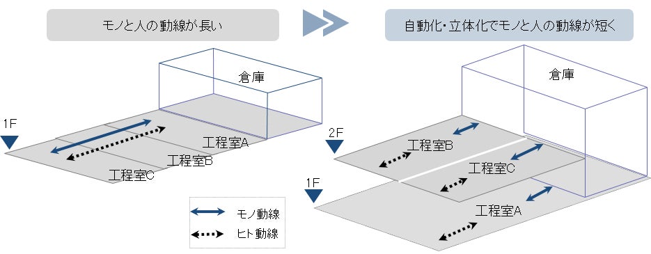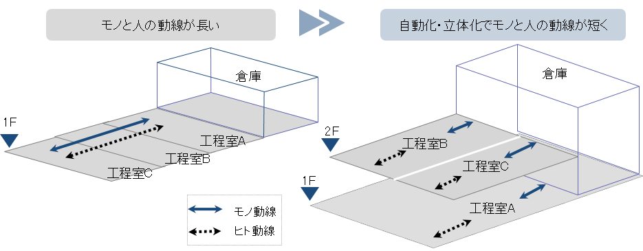 ✓自動化が進むスマートファクトリーでは、人やモノの動線が変わり、建物のレイアウトも変化する
