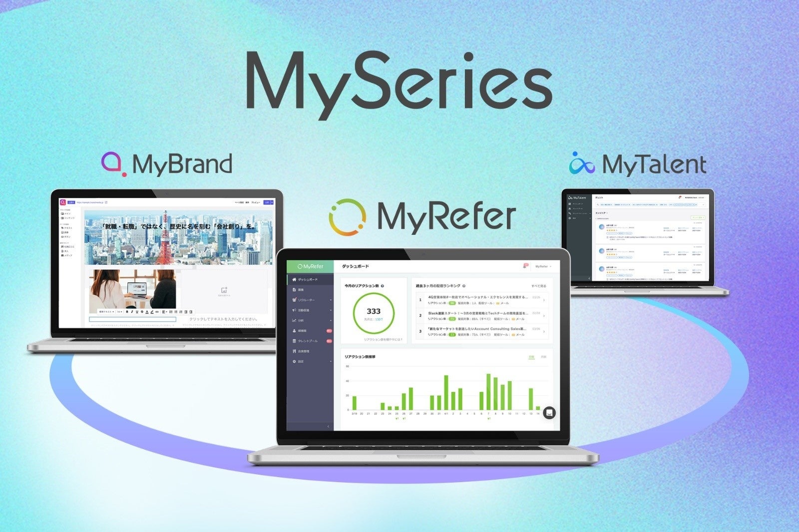 「Myシリーズ」とは、採用活動をマーケティングに変革し、優秀な人材を効率よく自前で獲得できるタレント獲得プラットフォームです。これまで「Myシリーズ」として、国内最大のリファラル採用サービス「MyRefer」、採用MAサービス「MyTalent」、採用ブランディングサービス「MyBrand」を展開してまいりました。エージェントや求人広告に依存した従来の採用手法から脱却し、競合とバッティングせずに、転職潜在層から応募獲得、自社の魅力付け、入社後の活躍を見据えたタレント・アクイジションを実現します。累計導入企業は1,000社を超え、企業規模や業界問わず、多数の領域でご利用いただいております。