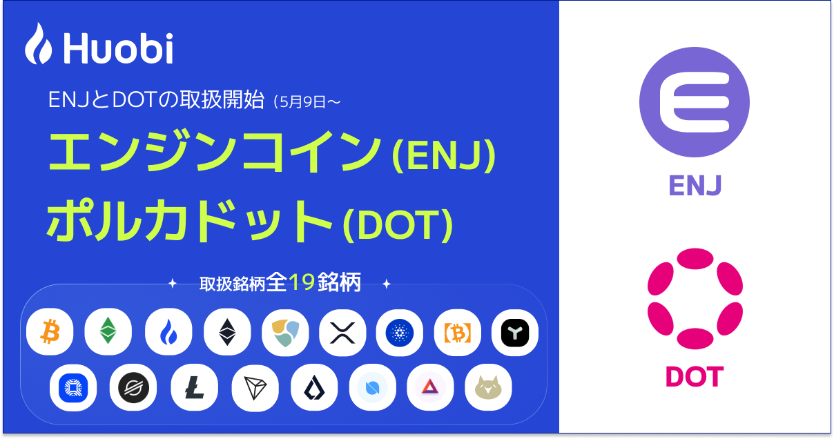 フォビジャパン株式会社(所在地:東京都港区、代表取締役社長:関 磊、以下「フォビジャパン」)は、暗号資産「Polkadot(ポルカドット)」、「Enjin coin(エンジンコイン)」の入金を5月9日(月)より開始、販売所・取引所での取扱いを5月11日(水)より開始することをお知らせいたします。
