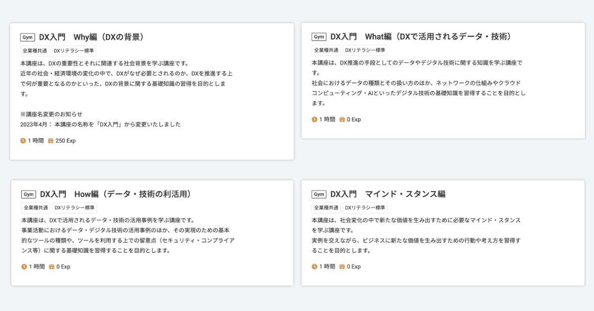 今回リリースした講座は、「DXリテラシー標準」において示されているWhy(DXの背景)、What(DXで活用されるデータ・技術)、How(データ・技術の利活用)、マインド・スタンス(社会変化の中で新たな価値を生み出すために必要な意識・姿勢・行動)のそれぞれに対応した講座で、ビジネスパーソン一人ひとりにDXリテラシーを学んでもらうことが狙いです。