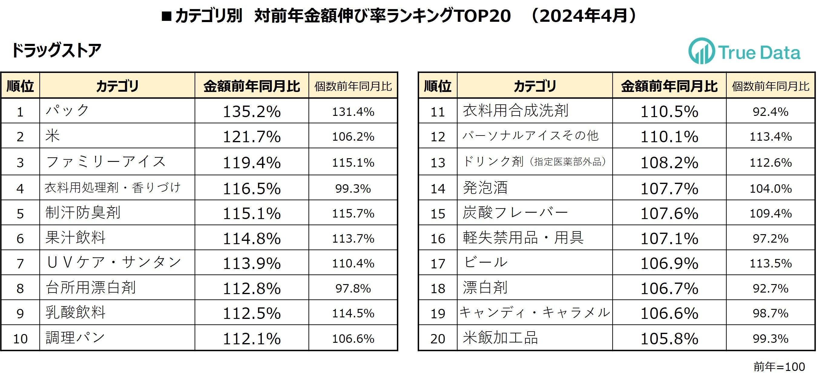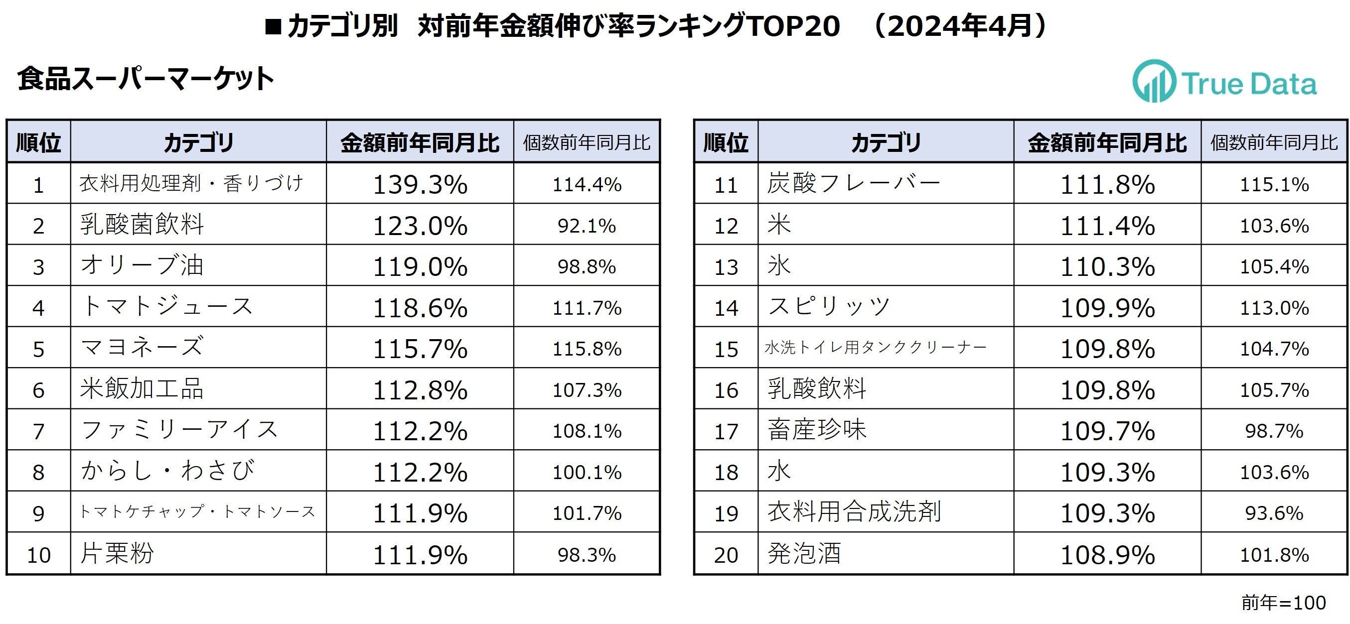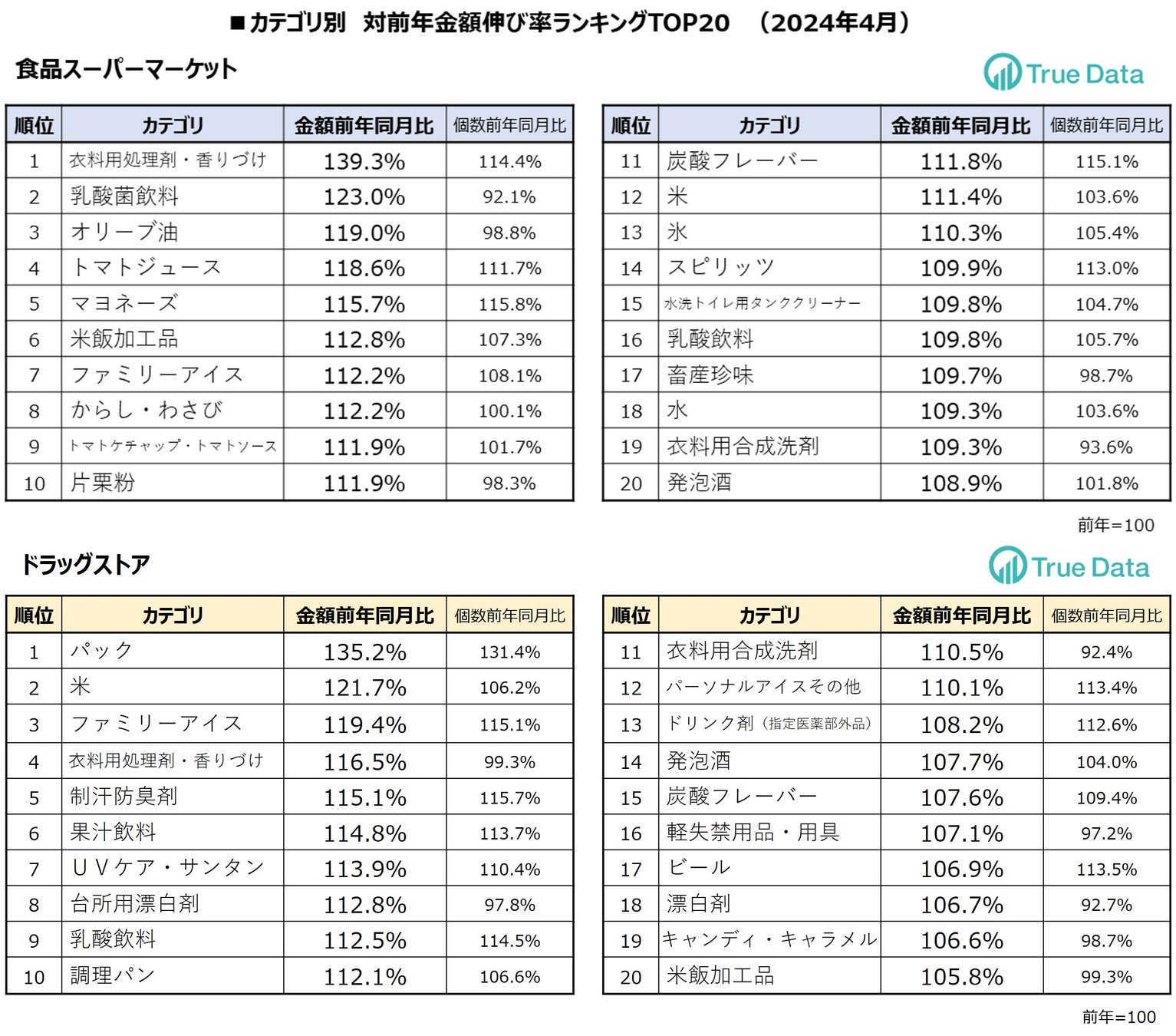 ~ドラッグストア、食品スーパーマーケット 対前年伸び率TOP20カテゴリを発表【2024年4月】~