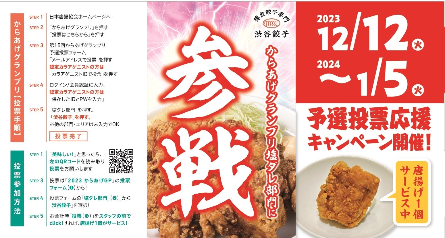 【渋谷餃子】からあげグランプリ塩ダレ部門に参戦!唐揚げ1個を“お試し”サービス中