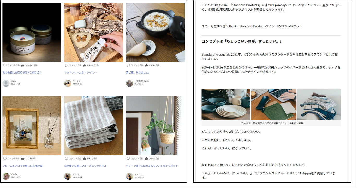 コミュニティ内イメージ(左:商品投稿ページ、右:読み物メージ ※Standard Productsの例)