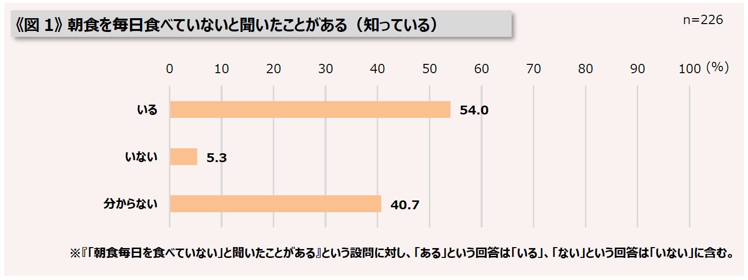 こども食堂運営者226名に対し、こども食堂に通うこどもたちの中で「朝食を毎日食べていない」と聞いたことがある(知っている)かを聞いたところ、「いる」と回答した割合が54.0%となりました《図1》。