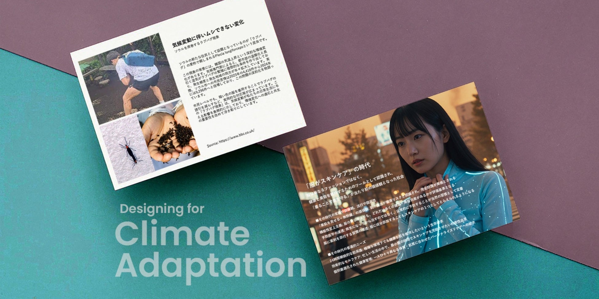 たとえば、韓国ソウルで発生したラブバグという昆虫大量発生の現象を起点に、「着ることで美を表現する」というこれまでの価値観から、気候変動によって「着ることでスキンケアにつながる」という価値観に転換する可能性を描くなど、気候変動適応による新しい世界観やビジネス機会を発想することが可能となります。
