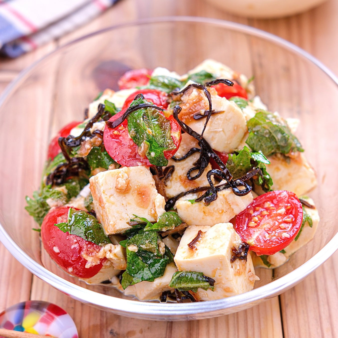 豆腐で満足感もあり大葉とミニトマトで爽やかに♪ 塩こんぶとかつお節のうま味が美味しさを引き立ててくれます!