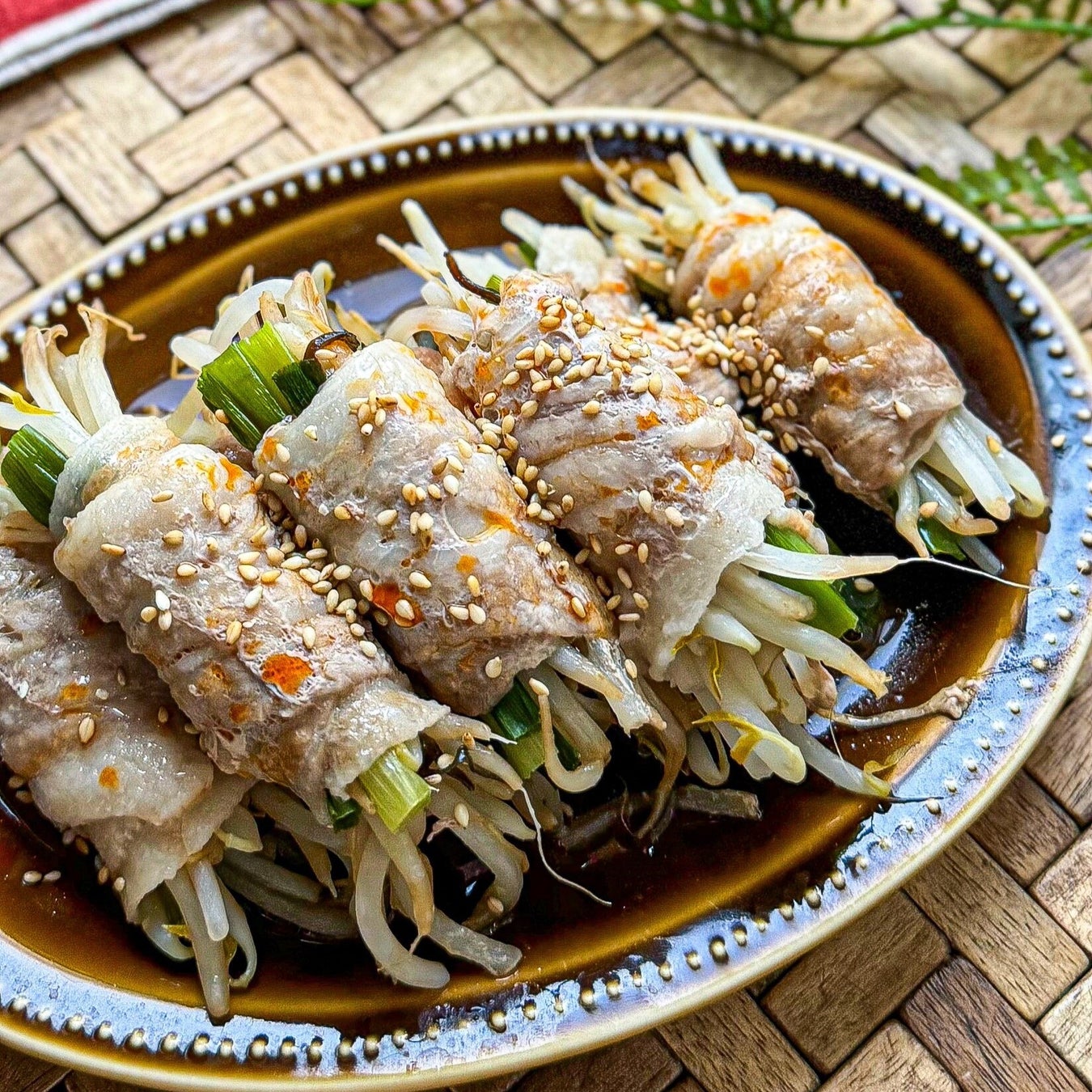 塩こんぶと辣油でバリ旨《もやしとねぎの肉巻き》