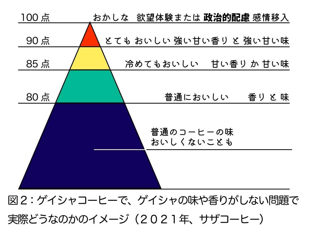 ブルーマウンテン、キリマンジャロ、など産地に価値にあるものは存在するが、パナマ・ゲイシャの本質的な価値は味だけでなはく、『香りの質や量』にある。品評会では「甘い香り」の強さの評価点が重要。だからこそ、パナマ・ゲイシャは価値が高く、値段も高くなる。